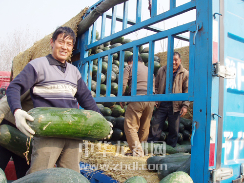 “長江以北地區(qū),每個城市都有俺的冬瓜賣?!?1月30日,鄲城縣錢店鎮(zhèn)徐橋村冬瓜基地里,來自全國各地的大型貨車排長成隊。瓜農徐慶祥數著鈔票樂呵呵地說:“俺種了3畝地冬瓜,畝產2萬斤,每斤兩毛五,賣了15000元,比種莊稼強多了?!毙鞈c祥說,他們的冬瓜之所以售價好,一方面是該村的土壤水分大,適合種冬瓜,在鎮(zhèn)里的引導下,目前已發(fā)展1000多畝,形成規(guī)模效應;另一方面多虧了冬瓜經紀人跑了大半個中國去推銷,把鄲城大個兒冬瓜叫成了一個品牌。在天津、山西、陜西等地,只要一說鄲城冬瓜,零售2元/公斤也不愁銷路。