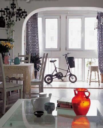 拱門外的陽(yáng)臺(tái)不會(huì)讓你一見鐘情卻說不定會(huì)讓你流連忘返,碎花藍(lán)窗簾、綠色的小植物,簡(jiǎn)約小凳,會(huì)引得你忍不住要坐過去……