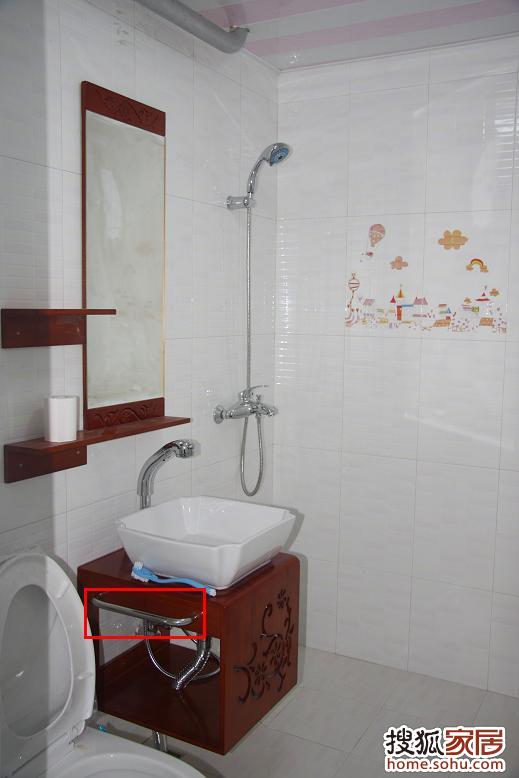 再放大一點(diǎn)。本來(lái)這個(gè)掛件是安在另一邊的,后來(lái)我發(fā)現(xiàn)從門(mén)口看柜子,下面都是管子,太亂了,所以,當(dāng)場(chǎng)叫師傅給改在靠門(mén)這邊了,將來(lái)掛上毛巾,就OK啦。
