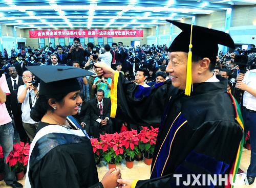 ??? 資料圖片:2010年7月6日,中國工程院院士、天津醫(yī)科大學(xué)校長郝希山(右)在學(xué)位授予儀式上,為畢業(yè)的留學(xué)生授予學(xué)位并撥穗。