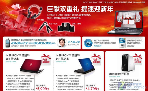 從12月27日到1月6日,戴爾推出了“巨獻(xiàn)雙重禮 提速迎新年”的促銷(xiāo):多款酷睿筆記本的處理器升級(jí),并且還送山水2.1音箱以及筆記本支架。其中,戴爾Studio 15z筆記本升級(jí)到了i5-480M處理器,升級(jí)之后還降價(jià)500元,目前的售價(jià)為7499元;戴爾靈越13R(Ins13RD-448)筆記本升級(jí)到了i3-380M處理器、500GB硬盤(pán),升級(jí)之后價(jià)格還是4999元;戴爾靈越13R(Ins13RD-438)筆記本升級(jí)到了奔騰雙核P6200處理器,升級(jí)之后價(jià)格還降到了4399元。