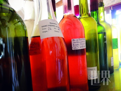 桃紅酒的顏色從哪里來?Adeline解答了我的疑問,其實顏色依然來自葡萄皮—將葡萄搗碎倒入發(fā)酵缸幾天后將葡萄皮撈出,而不是像釀造紅酒一樣在整個發(fā)酵過程中都保留葡萄皮,這樣葡萄皮為酒體增添了適量的顏色和丹寧酸,但較紅酒色澤淺,丹寧酸含量低,因而口感更清爽。
