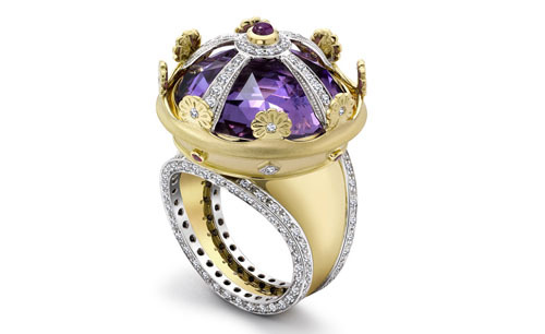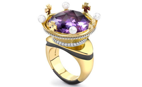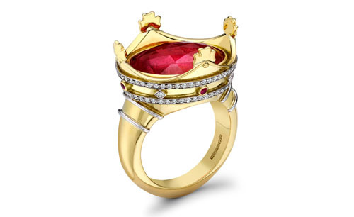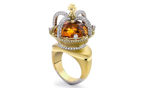 Theo Fennell善于找樂(lè)子,這一次,他對(duì)風(fēng)靡全球、大受追崇的皇室婚禮排場(chǎng)表示不屑。對(duì)于那些自我感覺(jué)配得上金光閃閃的皇室珠寶的人們而言,Theo Fennell提供了皇冠戒指系列供其選擇。對(duì)Theo Fennell來(lái)說(shuō),每件珠寶杰作均是為那些崇尚趣味性以及青睞傳統(tǒng)的人們精心打造的。這些珠寶比茶巾或婚禮杯更有品味。