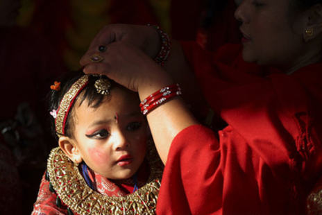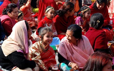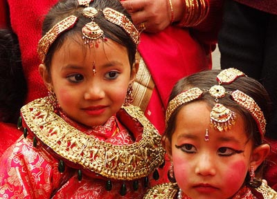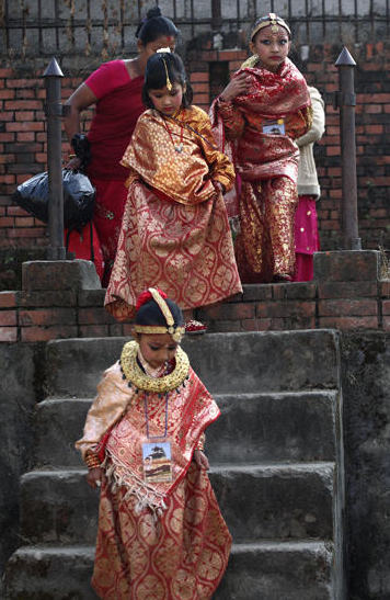 尼瓦爾族女孩一生“結(jié)”三次婚,第一次嫁給木蘋果(孟加拉蘋果),稱之為果實(shí)婚;第二次嫁給“太陽”;第三次才是與一個(gè)男人結(jié)為夫婦。