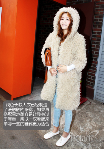 今冬毛絨絨的外套不知道有多走俏!不再一味的走俏“貂”毛線路,羊毛卷、鴕鳥毛元素憑借可愛清純的賣相,超好的手感贏得不少時(shí)尚MM們心動(dòng)。喜愛之余的猶豫莫非身材問題,切忌!不要穿得像只熊哦!