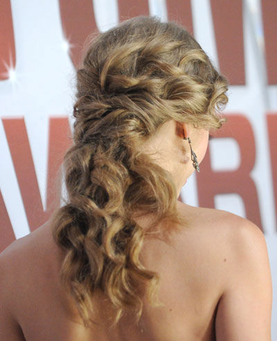 泰勒·斯威夫特的這款花辮更簡單卻足夠漂亮,但是前提是你的頭發(fā)本身已經(jīng)是卷發(fā)。