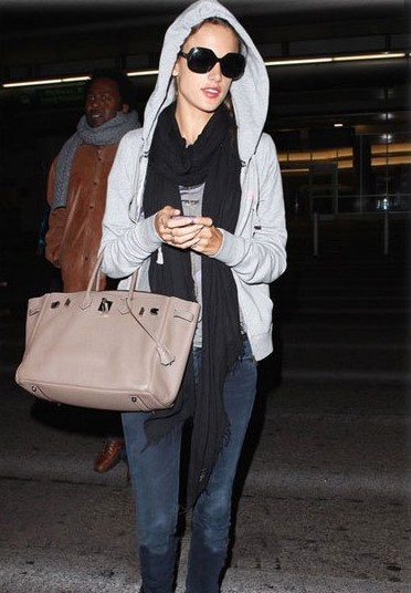 時尚解析:打扮很休閑,灰色衛(wèi)衣搭配黑色圍巾和牛仔褲以及帆布鞋就OK,再搭配藕色鉑金包,彰顯身價