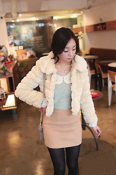 蕾絲翻領的打底衫搭配裸色包臀短裙,外搭米色短打皮草外套,優(yōu)雅不俗氣,輕松打造復古甜美女孩