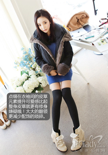 給你的羽絨服添加可愛皮草吧! 1.給你的羽絨服添加可愛皮草吧! 浪漫的下雪天怎能馱著“大塊頭”前去會(huì)男友?趕快打消念頭!嬌小可愛才是男友的最愛。選件短款羽絨服好身材才會(huì)大方顯露哦。衣袖間的可愛毛茸茸,一下提升可愛俏皮味兒。內(nèi)搭的針織連身裙,S曲線他怎能不愛呢