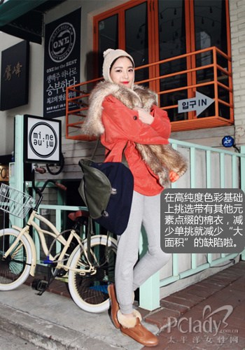 亮色羽絨服容易穿得搶眼,但千萬不要頂上“大塊頭”的稱號(hào) 2.亮色羽絨服不要單調(diào)穿哦! 黑白灰當(dāng)?shù)赖亩?,年輕女孩又怎能錯(cuò)過彰顯個(gè)性的亮麗色彩呢?亮色羽絨服容易穿得搶眼,但千萬不要頂上“大塊頭”的稱號(hào)哦!羽絨服增添抽縮腰帶或是皮草元素吧。即使點(diǎn)綴毛線圍巾也會(huì)打破原來的單調(diào)。自然不會(huì)有大面積色塊感啦