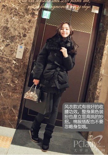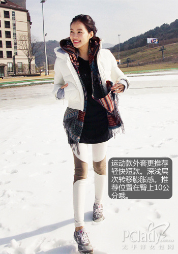 ????3.運(yùn)動(dòng)款羽絨服還是短款好 ????喜歡運(yùn)動(dòng)款羽絨服的MM總會(huì)避免不了上身的魁梧感。其實(shí)只要注意色彩層次就會(huì)平衡空間感啦。黑色內(nèi)帶長衫與淺色打底褲,女孩的活力真的可以渲染所有人的眼球哦 ????4.羽絨服過臀10公分遮擋粗腿沒問題 ????梨型身材的MM總是擔(dān)心自己下半身,粗粗的大腿、寬寬的胯部,真的不要原形畢露哦!試試過臀10公分的羽絨服吧!剛好遮擋,也不顯個(gè)子矮小哦