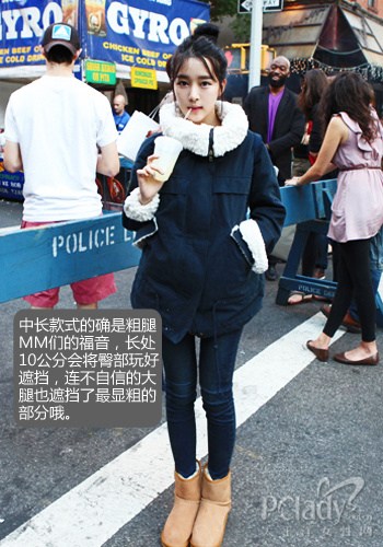 ????4.羽絨服過臀10公分遮擋粗腿沒問題 ????梨型身材的MM總是擔(dān)心自己下半身,粗粗的大腿、寬寬的胯部,真的不要原形畢露哦!試試過臀10公分的羽絨服吧!剛好遮擋,也不顯個(gè)子矮小哦