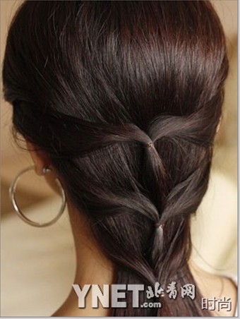 3:把發(fā)尾往回扎,在左右兩邊的辮子交叉處用小發(fā)卡固定住。
