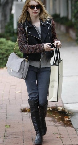 時尚解析:今年流行的雙材質(zhì)拼接式外套,短款機車式,很容易搭出層次感,而且也能讓身材比例看起來更加完美,搭配長靴,時尚帥氣