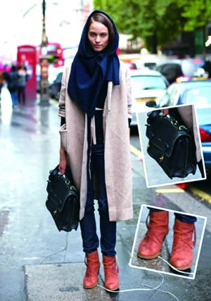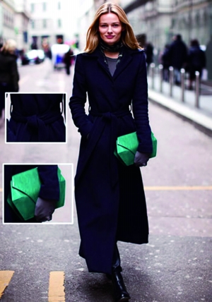 1.簡約大方的藏青色大衣,是永恒流行的必買單品。收腰的款式顯瘦大方,內(nèi)搭的灰紗和皮褲若隱若現(xiàn),飄逸的裙擺讓你優(yōu)雅萬分,無論走到哪都會吸引住別人的目光