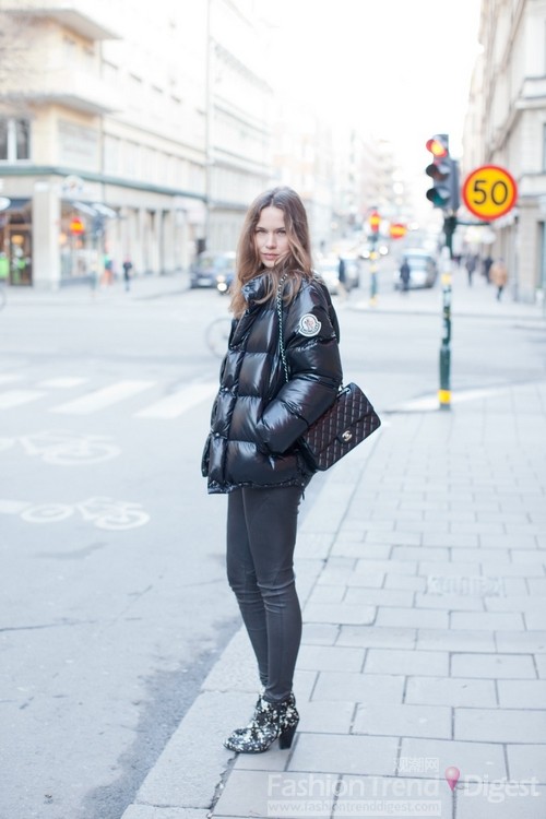 1. 黑色羽絨服也許是街頭最最常見的御寒工具了,如果想要穿出明星味兒,那就得準(zhǔn)備一款精致的單肩包,搭配深色緊身褲,而腳下可以選擇一雙裝飾性強(qiáng)的高跟鞋,比如這位達(dá)人腳下的亮片高跟鞋,讓整個造型多了幾分前衛(wèi)感