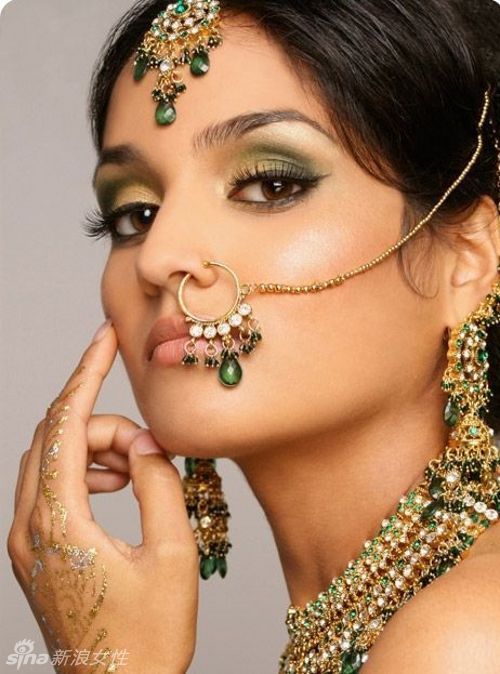 印度新娘首飾種類繁多,有耳環(huán)、項鏈、戒指、手鏈、手鐲、發(fā)飾、額飾、胸飾、腳鏈等?;槎Y慶典是婦女展示首飾的最佳時刻。佩戴多少首飾,是婆家衡量新娘嫁妝是否豐厚的重要標準