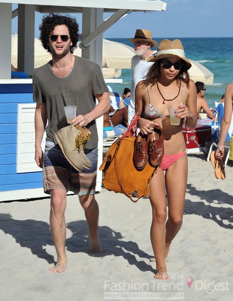 1. 佩恩·貝格利 (Penn Badgley)和佐伊·克拉維茨(Zoe Kravitz)這對新夫妻來到了南部海灘度假,男士穿的是灰色T恤和沙灘褲,女生則是選擇了一件性感的印花比基尼享受海灘的度假感覺。
