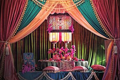 考究的新人,還會(huì)搞點(diǎn)真家伙。比如,有新人喜歡那種東北風(fēng)格的土炕,于是索性在婚禮上做出一個(gè)搬到舞臺(tái)上,主桌的人必須脫鞋上炕,才能吃到酒菜。不過(guò),這可得花上點(diǎn)代價(jià),因?yàn)閷m燈、景泰藍(lán)鐲子這樣的東西都是古玩市場(chǎng)可以淘來(lái)的,但土炕卻要純?nèi)斯ぶ谱?,還有人喜歡亭臺(tái)樓閣,會(huì)制作出有飛檐的雕龍畫鳳的樓宇,單是兩根紅木大柱子價(jià)格就貴得嚇?biāo)廊恕V谱鬟@樣婚禮的新人婚宴的排場(chǎng)通常都很大,他們需要在大場(chǎng)地上做出吸引眼球的獨(dú)特布置