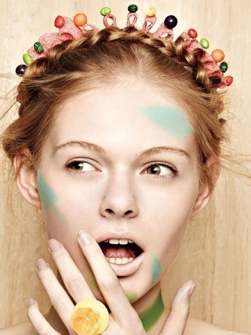 手上戴著鉆石糖戒指,頭上戴著彩虹糖頭飾,隨意抹在臉上的色塊也讓整個妝容感覺到了2012春夏的妝容味道