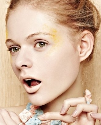 手上戴著鉆石糖戒指,頭上戴著彩虹糖頭飾,隨意抹在臉上的色塊也讓整個妝容感覺到了2012春夏的妝容味道 嘴唇用接近膚色的粉白色,像不像剛吃完沾滿糖霜的糖果?眉尾用明亮的黃色打亮,你感覺到那股清新了嘛