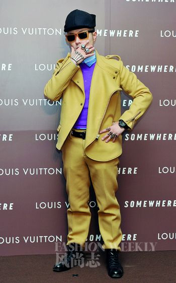 日本多棲藝人Verbal 身著芥黃色西服套裝和Prada香芋紫針織衫,混搭水波浪藍(lán)襯衣,可謂和諧。而黑色配飾又讓這整身行頭顯得有力度。