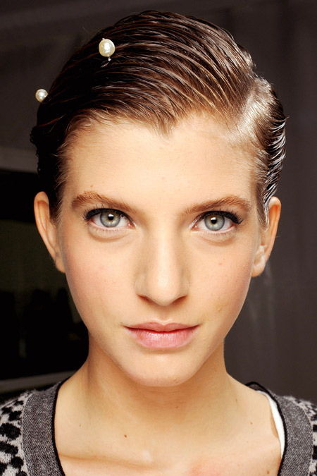 ??? 香奈兒 (Chanel) 2012春夏巴黎時裝周秀場上,彩妝師Peter Philips 把妝容重點放在光澤上,體現(xiàn)出唯美純凈和淡淡的奢華,與裝點的施華洛世奇半圓形珍珠相映生輝。他用白皙又有光澤的底妝配上了粉色珊瑚色的腮紅,濕潤并微閃光澤的眼影,最后以黑色的眼線收尾。嘴唇上也帶著微微的珠光,最亮的只有粉色唇彩和被貼在模特的眉毛、耳朵和鼻側(cè),或者濕潤的頭發(fā)上的白色珍珠。