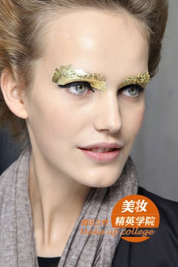 趨勢三:輔助裝飾品 從芬迪的金色樹葉、紀梵希的圓形亮片,到香奈兒的珠狀物、維果羅夫的紙片裝飾,各種各樣的材料都被貼在臉上,成為春季妝容的一大亮點。通過使用塑料、閃光物以及金屬指甲貼,曼尼什?阿若拉、蒂埃里?穆勒、加勒斯?普的時裝秀使這一創(chuàng)意更加豐滿。 趨勢四:夸張睫毛裝 路易?威登夸張的眼睫毛使眼睛變得更加立體,這一夸張的眼妝在杜嘉班納的時裝秀上也曾出現(xiàn)