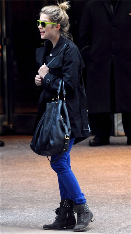 時尚解析:藍(lán)色的小腳褲使得腿部的線條看起來更加的纖細(xì),加上寬大的上衣,看起來顯得更加的纖細(xì)