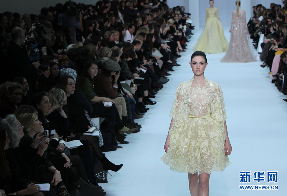 ??? 1月25日,模特在巴黎高級定制時(shí)裝周上展示ELIE SAAB品牌的2012/2013春夏新品。來自黎巴嫩的ELIE SAAB品牌推出淡色系列,以淡粉、淡藍(lán)、淡綠、淡青等詮釋新一季春夏新品。 新華社記者高靜攝