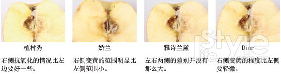 在一半蘋果上涂產(chǎn)品,30分鐘后觀察蘋果變黃的情況,來判斷抗氧化功效。