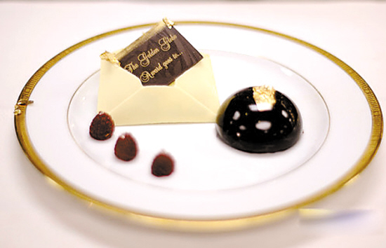 與奧斯卡頒獎典禮上嘉賓們在臺下依次坐好不同,金球獎頒獎禮是以宴會的形式款待1300位嘉賓的。引發(fā)爭議的這種巧克力布丁甜點,由酒店甜點大廚托馬斯·亨齊耗時6個月設(shè)計,用杏仁制成,并用刺槐蜂蜜、焦糖和新鮮漿果裝點,表面還撒有每克價值高達135美元的食用金箔。亨齊手下40名大廚和110名員工加班加點才制作完成了宴會所需的千多份甜點。亨齊解釋在布丁上撒金箔的創(chuàng)意時說,這樣做使得甜點與金球獎的意蘊相得益彰,金箔甜點與當(dāng)晚向嘉賓們提供的2002年份的酩悅香檳可謂絕妙配搭。