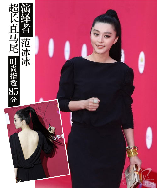 演繹心機(jī):范冰冰這款帥氣的馬尾充滿了獨(dú)屬于東方神秘的美感,柔順黑亮的秀發(fā)是最好的裝飾。高聳的馬尾綁緊后將一部分頭發(fā)纏在馬尾根部,走動(dòng)起來(lái)頗有幾分俠女的風(fēng)范??上н@款發(fā)型實(shí)在是太挑人了,不僅要求臉型夠小,而且五官也要足夠出挑才能駕馭,雖然效果確實(shí)很好,但是鑒于普及度不高,只能停留在85分的時(shí)尚指數(shù)了