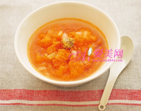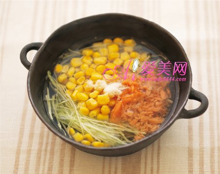 材料:罐頭鮭魚(yú)2勺、玉米粒30克、椰菜葉1片、喼汁1茶匙、鹽1/4茶匙、水200毫升。
