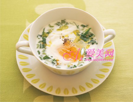 材料:小松菜30克、生雞蛋1個(gè)、鹽1/3茶匙、牛奶200毫升、橄欖油少許、醬油少許。