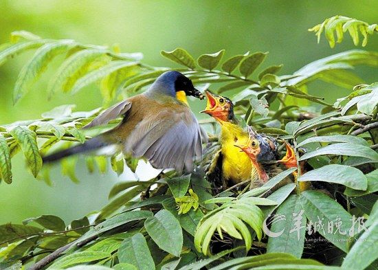 江西省婺源縣,黃喉噪鹛在哺育幼鳥(niǎo) 沈俊峰 攝