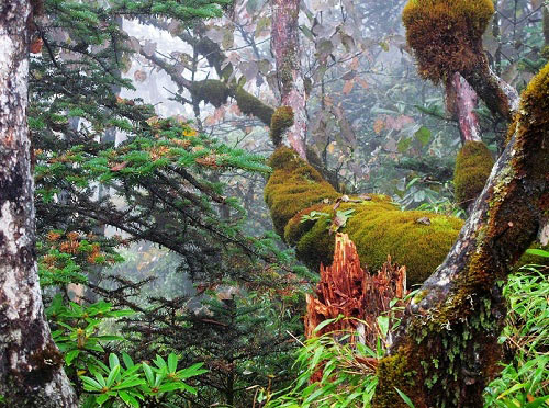 ·溝里天氣變化無常,本來還是晴好天氣,一陣山霧襲來,卻淅淅瀝瀝地下起了山雨,沒帶傘也沒關(guān)系,反正雨也不大。山雨和迷霧中,黑竹溝又憑添一種水淋淋的嫩綠和清新,憑增一份神秘的迷幻和空朦。