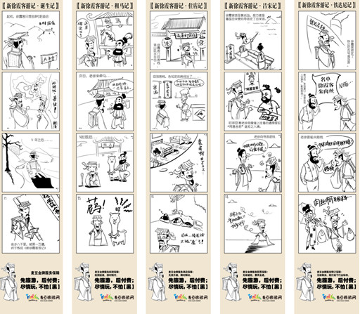 據(jù)悉,這組《新徐霞客游記》是麥豆旅游網(wǎng)發(fā)起的“麥豆旅游曬黑”行動做宣傳。所謂“麥豆旅游曬黑”,即鼓勵網(wǎng)友把自己旅游過程中遇到“被黑”的經(jīng)歷給曬出來,既有為消費者敲響警鐘的目的,又能督促改善旅游市場目前一些病態(tài)現(xiàn)象。