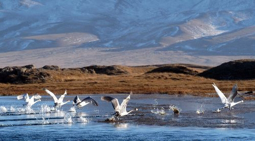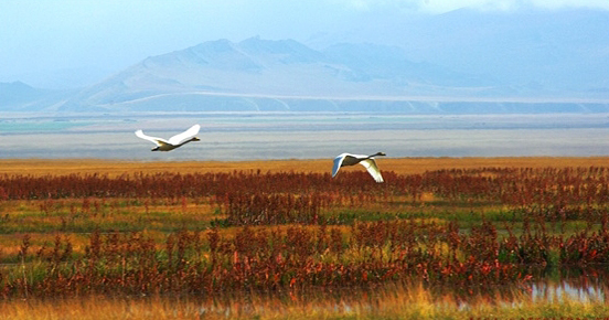 天鵝湖位于巴音布魯克草原尤勒都斯山間盆地,海拔2000——2500米,是一個(gè)東西長30公里,南北寬10公里的高原湖泊,面積300多平方公里。1986年被批準(zhǔn)為國家級天鵝自然保護(hù)區(qū),是中國最大的天鵝棲息繁殖地。連綿的天山,聳入云霄的冰峰,構(gòu)成了天鵝湖的天然屏障。泉水、溪流和雪水匯入的湖中,水豐草茂,食料富足,氣候涼爽而濕潤,適合天鵝生長。每當(dāng)春天來到,冰雪消融,萬物復(fù)蘇,大批天鵝從印度和非洲南部成群結(jié)隊(duì)飛越叢山峻嶺,來到天鵝湖棲息繁衍。在和煦的陽光下,湖水、天光、云影、天鵝,構(gòu)成一幅“片水無痕浸碧天,山容水態(tài)自成圖”的畫卷。當(dāng)?shù)孛晒抛迥撩癜烟禊Z視為“貞潔之鳥”、“美麗的天使”、“吉祥的象征”,格外珍愛。