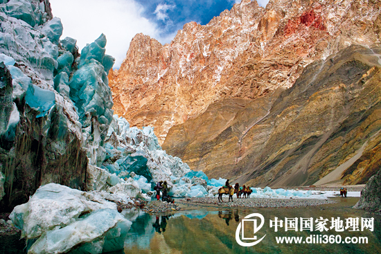 在克勒青河谷的冰瀑區(qū),崩塌的冰塊像一塊塊青色透明的水晶散落在喀喇昆侖山中。5月份進(jìn)入克勒青河谷,冬季的冰雪正在慢慢融化,匯集的河水清澈見(jiàn)底,沒(méi)有一絲污染,純凈的天地,令人神往。