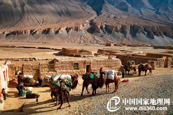 村子海拔3500米,大約50戶人家,幾乎全部為柯?tīng)柨俗巫?。村里的一些男人以牽駱駝和兼作向?qū)楦睒I(yè),出發(fā)前一位曾進(jìn)入喀喇昆侖山科考的專家特意囑咐我們,一定要雇用柯?tīng)柨俗巫逑驅(qū)Ш退麄兊鸟橊?。這些駱駝長(zhǎng)年生活在帕米爾高原,適應(yīng)高海拔的氣候,而且載重量大,一峰駱駝可以承受200公斤的重量。要深入喀喇昆侖山,要攀登喬戈里峰,無(wú)論多有名的登山家,都必須依靠它們。