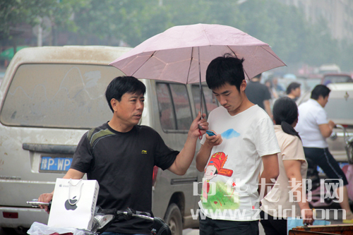 上午8點(diǎn)30分天空下起小雨一家長(zhǎng)為考生撐起雨傘。