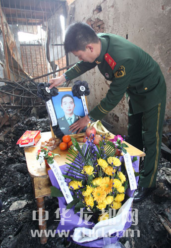 ????正月十五元宵節(jié),人們齊聚在鄭春光犧牲的那間不大的商鋪門(mén)前,在那間已經(jīng)被熏黑的墻壁上掛上潔白的小花:“鄭春光你是人民的好兒子”、“春光我們永遠(yuǎn)懷念你!”、“春光一路走好!”字字真情、句句感動(dòng),表達(dá)著人們對(duì)這位好男兒的無(wú)限哀思。人們端來(lái)了熱騰騰的湯圓放在鄭春光犧牲的門(mén)前,所有的人們面對(duì)春光犧牲的地方,為他們心中的英雄深深地鞠了三躬。一位淚流滿面的老人哽咽著:“春光,好孩子,我給你送元宵來(lái)了!好孩子,你吃點(diǎn)吧!吃點(diǎn)吧!”在場(chǎng)的人們哭聲一片。