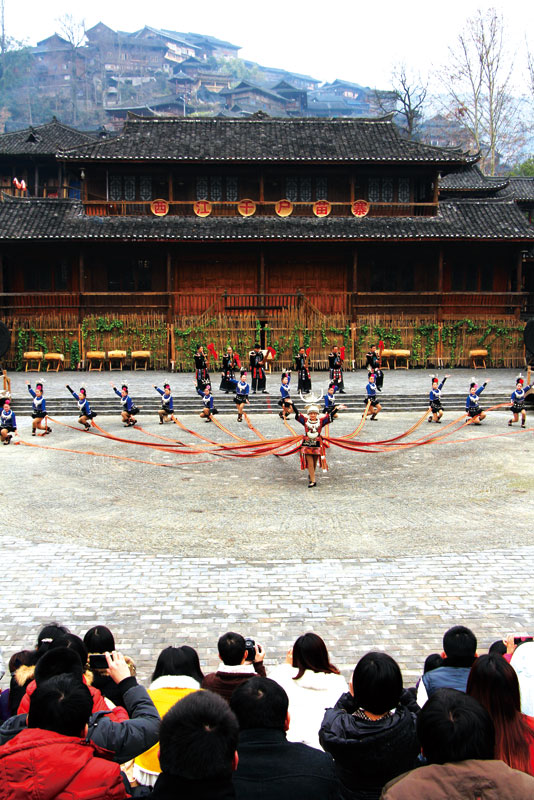 在西江苗寨的生態(tài)歌舞表演上,游客可以欣賞到銅鼓舞、木鼓舞、蘆笙舞、錦雞舞、苗族古歌、苗族飛歌等特色民俗表演。