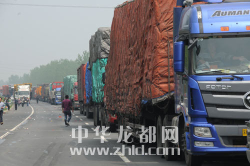 ????昨日11時(shí)許,記者驅(qū)車前往寧洛高速周口收費(fèi)站,但前往現(xiàn)場(chǎng)的通道臨時(shí)封閉,記者只好返回,再沿周漯公路行駛。由于高速公路被封,眾多車輛被分流至公路上,造成周漯路部分路段堵車,直至12時(shí)許,記者才到達(dá)距周口市區(qū)約30公里處的事故現(xiàn)場(chǎng)。