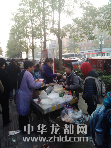 ???????11月18日7時許,記者在大慶路與育新路交叉口東側(cè)看到,從這里到周口市第一初級中學門口數(shù)百米人行道上,經(jīng)營奶茶、面包、豆?jié){等食品的流動攤販有一二十個,并且每個攤位前都圍著不少學生(如圖)。