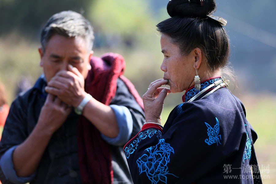 ????苗族人民在祭尤節(jié)上吹奏苗族傳統(tǒng)樂器——木葉
