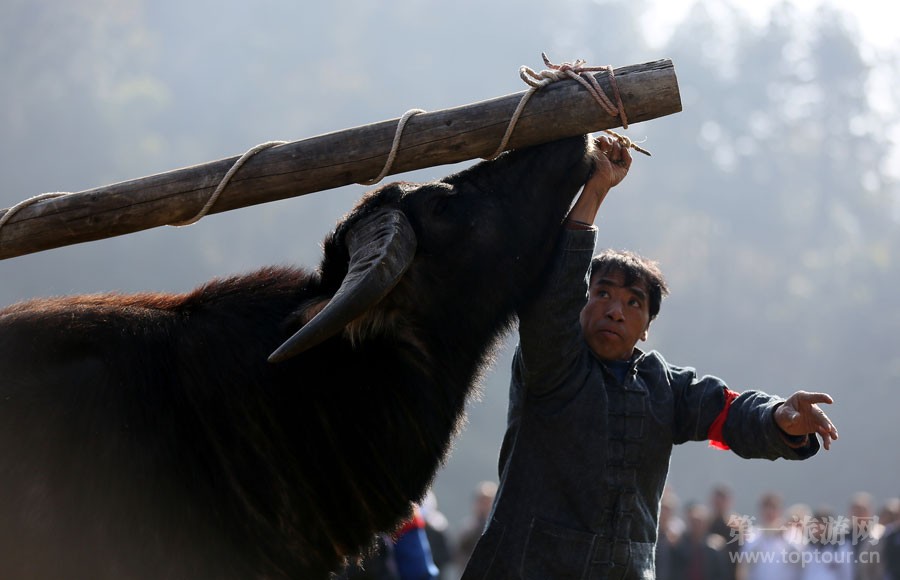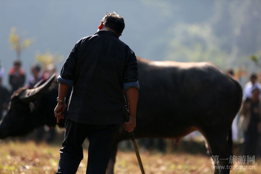 ????祭師在祭尤節(jié)祭祀儀式上準(zhǔn)備宰殺作為祭品的水牛