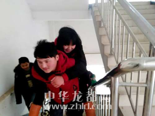 ????雷偉每隔幾天就背一次孔雪珂,這已成了他學校生活的一部分?!俺宋冶晨籽╃嫔舷聵峭?,我們班其他26個男生也都背過她。我作為班長,理應多做一些?!卑芽籽╃姘踩偷浇淌遥讉ビ悬c不好意思地說,“第一次背她,我有點兒害羞,但如今已經(jīng)習慣了?!?/p>