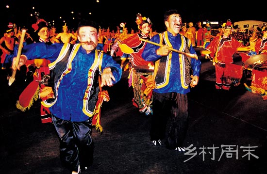 ????在踩街隊(duì)伍中,熱情奔放、剛勁詼諧的“拍胸舞”很能贏得觀眾喝彩。清一色體魄強(qiáng)壯的漢子,頭戴草箍,裸露上身,邁著蹲襠步,雙手依次拍擊胸、肋、腿,全身隨音樂(lè)、情緒的變化舞動(dòng)?!芭男匚琛笔侨葑钇毡?、最典型、最具代表性的一種古老的民間男性群體舞蹈,入選國(guó)家非物質(zhì)文化遺產(chǎn)名錄。雖然是冬天,但是跳拍胸舞的人不懼寒冷,個(gè)個(gè)投入地表演,把閩南人豪放又樂(lè)觀的個(gè)性展露無(wú)遺。